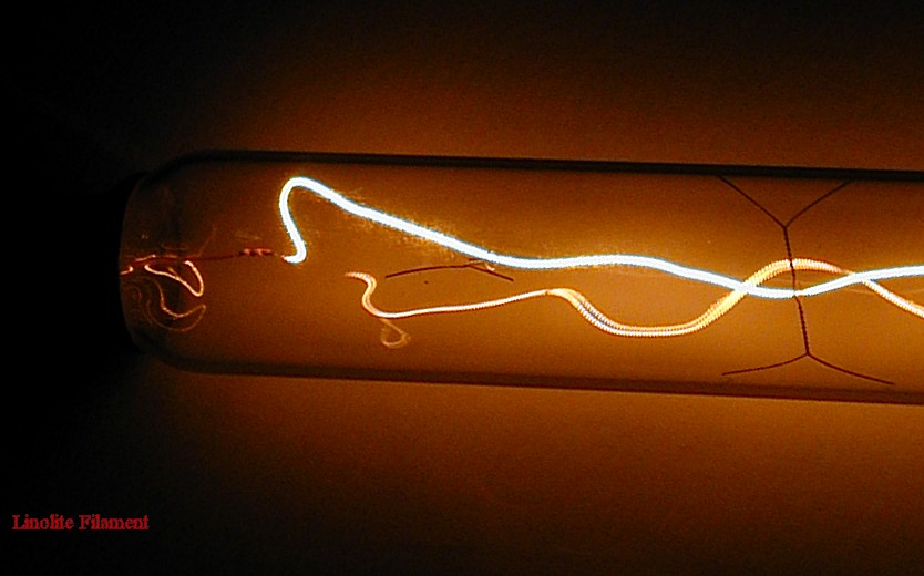 I promised James some close-up pictures of a Linolite lamp I recently bought, I thought others might be interested so I'll post them here. I'm comparing the Linolite with a similar Mazda bulb of about the same length (11") The camera caught some weird reflections from the Mazda's filament but you can get an idea of what the coil shaped filament looks like hopefully:
