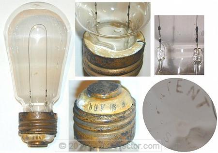 The plaster filled base is very short and identical to those used on ca.1884 Edison lamps. The filament is a typical “U” shape but has two carbon paste weld joints on the platinum lead-in wires. There is no glass stem but rather two glass pipes protruding from the base which form a round pinch that supports each leg of the filament. Carl Seel patented a process for producing a homogeneous silk filament in 1888. |
